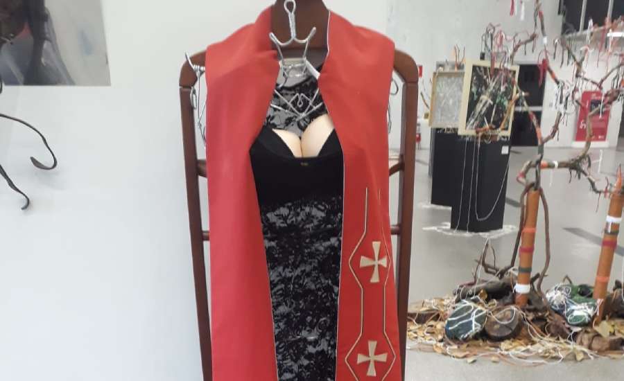 A exposição foi denunciada inicialmente pelo Mova Brasil (Movimento de Valores), um movimento de leigos católicos que desejam defender os valores de vida, família e liberdade na política. Em um vídeo publicado nas redes sociais, o diretor de formação do Mova Brasil, Uner Augusto de Carvalho Alvarenga, mostrou algumas peças que fazem parte da exposição. Entre elas, uma intitulada “Descorpo”, em que uma estola vermelha foi colocada em um manequim sobre uma lingerie preta com parte dos seios a mostra. Em outro quadro há as mãos postas em oração e variações na expressão “sangue de Cristo” até se transformar em “sangue de dízimo”. Outras peças fazem referência à cruz, sendo que uma dela associa a cruz à suástica nazista.