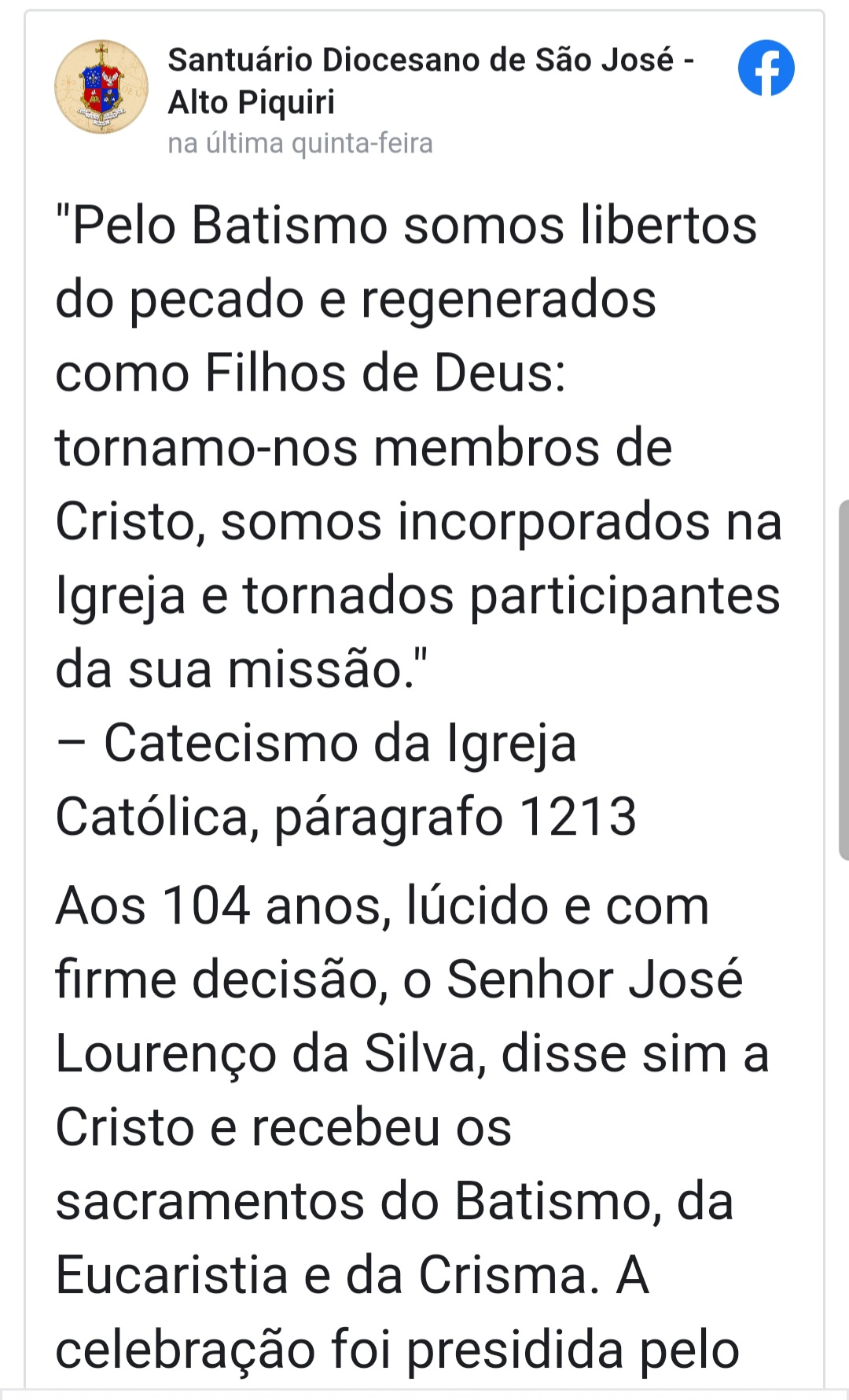 No último dia 17 de junho, aos 104 anos de idade, o Sr. José Lourenço da Silva recebeu finalmente os sacramentos da iniciação cristã, ou seja, o Batismo, a Primeira Eucaristia e a Confirmação ou Crisma.